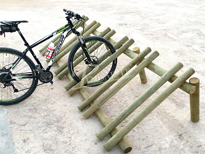 Aparcabicis fabricado en madera para exteriores tratada riesgo IV. Estructura según Manual de Caminos Naturales. Conjunto con capacidad de 6 plazas.
