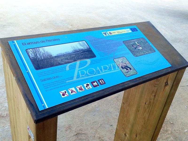 Atril fabricado en madera para exteriores tratada riesgo IV. Soporte gráfico formado por placa de acero corten e información sobre placa de aluminio-dibond rotulada con vinilo polimérico laminado UV y con protección anti-grafitti.