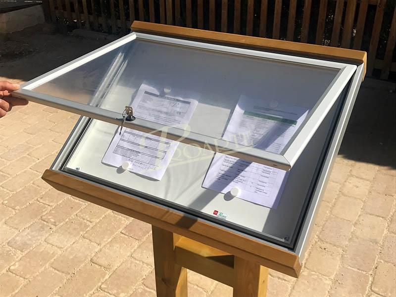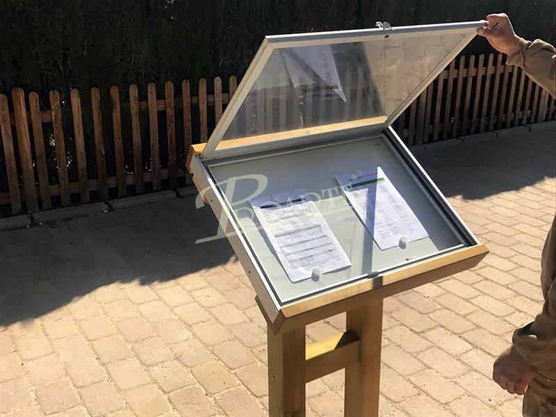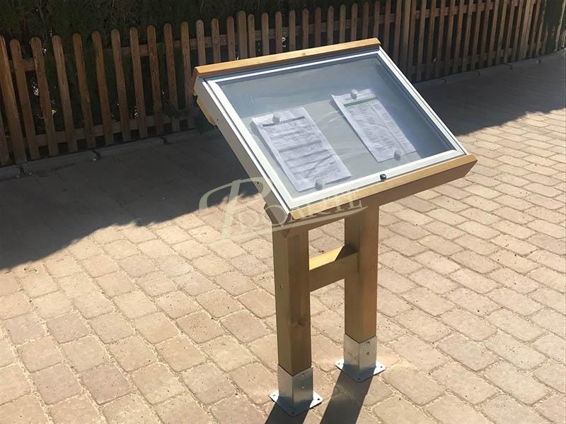 Atril fabricado en madera para exteriores tratada riesgo IV. Vitrina informativa con marco de aluminio anodizado.