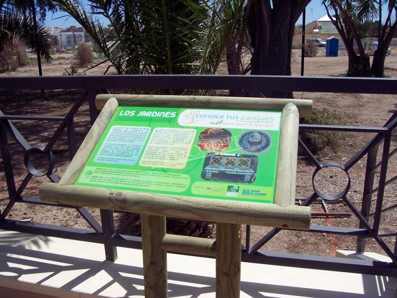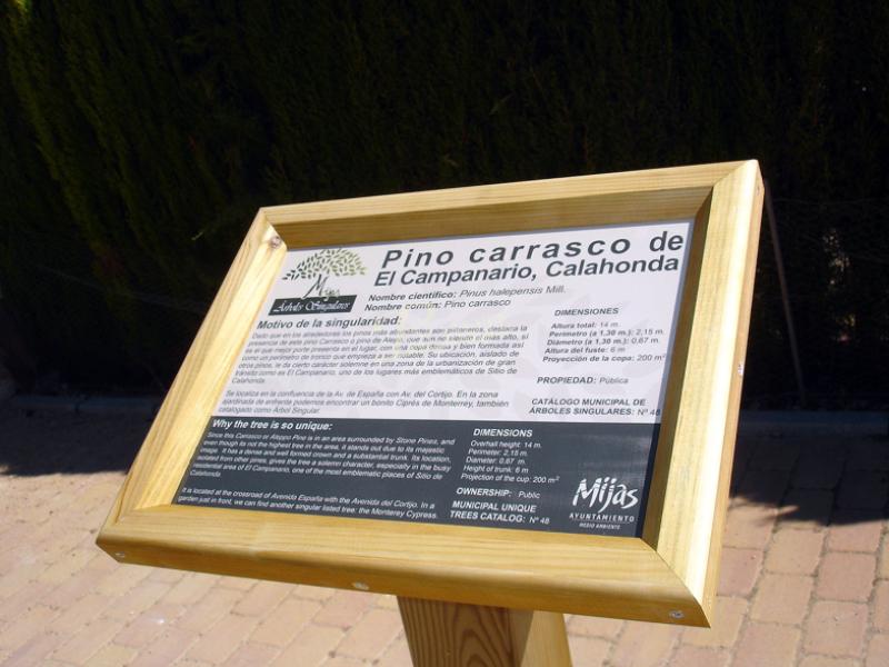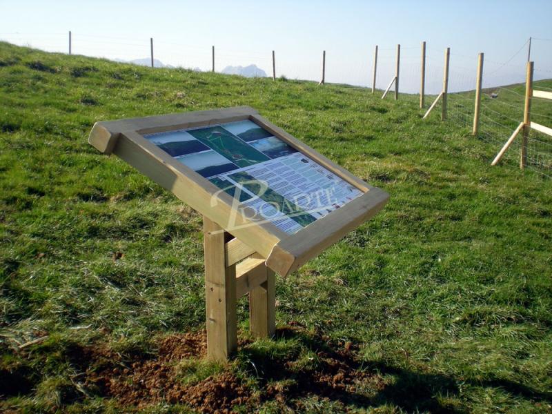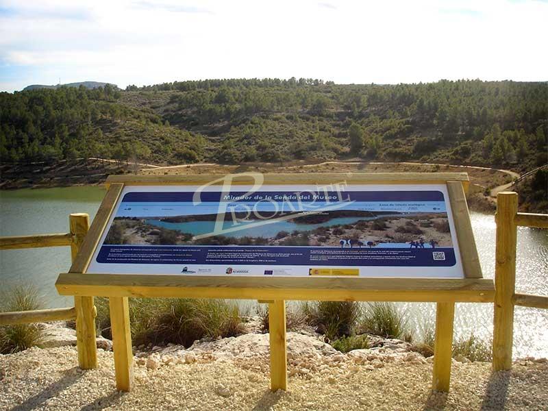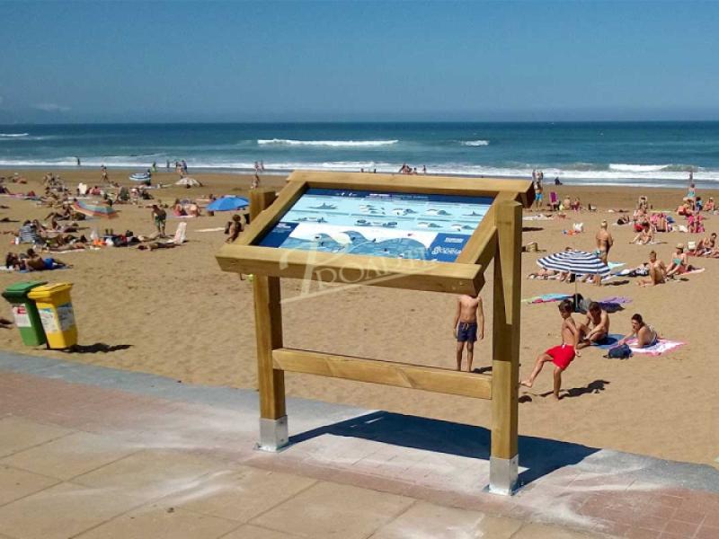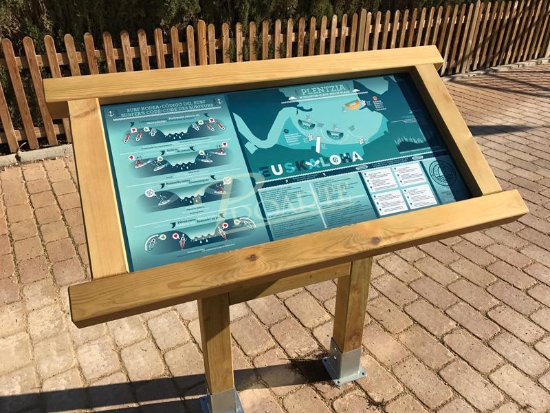 Atril fabricado en madera para exteriores tratada riesgo IV. Soporte gráfico formado por placa de resinas termo-endurecidas de uso severo para exteriores e información rotulada con vinilo polimérico laminado UV y con protección anti-grafitti.