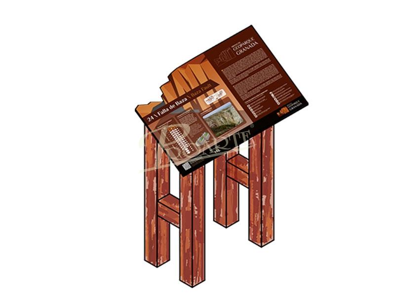 Atril interpretativo fabricado en madera para exteriores tratada para clase de riesgo IV. Estructura fabricada con 4 postes de sujeción, con refuerzo trasero, soporte no enmarcado.