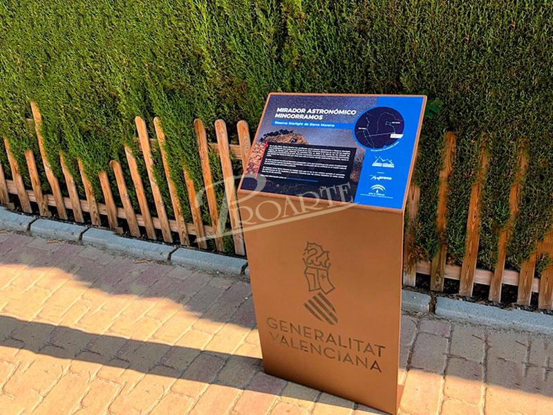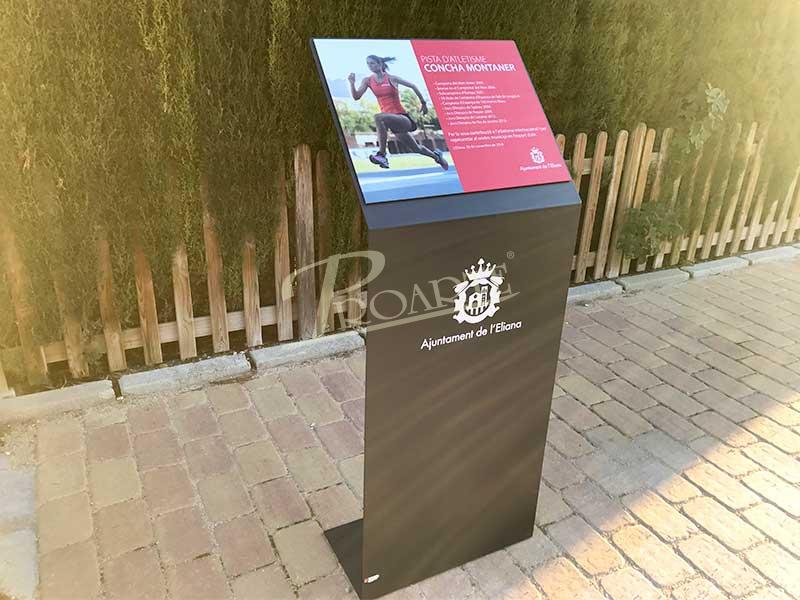 Soporte gráfico en placa de aluminio e información a una cara rotulada con vinilo polimérico laminado UV y con protección anti-grafitti.