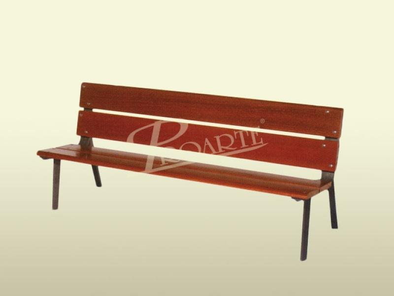 Banco fabricado en madera tropical y estructura metálica. Formado por tablas de madera tropical barnizada con lasur y pies de fundición dúctil acabados con oxirón. Tornillería de acero cincado.