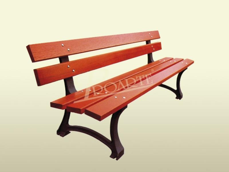 Banco fabricado en madera tropical y estructura metálica. Formado por tablas de madera tropical y pies de fundición dúctil acabados con oxirón. Tornillería de acero cincado.