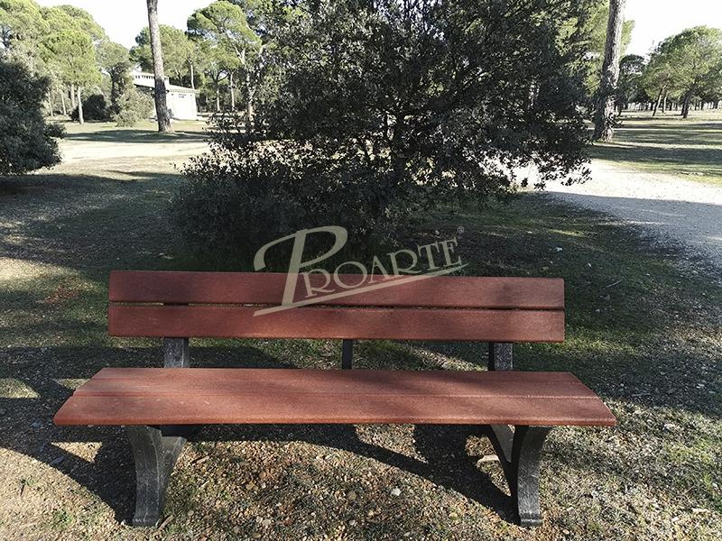 BANCO PERPIGNAN PLÁSTICO RECICLADO con respaldo. Banco fabricado en plástico 100% reciclado y reciclable. Estructura formada por patas y revestimiento de perfiles de plástico reciclado. Acabado color marrón. Tornillería de acero cincado. Dimensiones del conjunto 180 largo x 70 ancho x 76 altura cm.