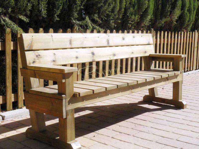 Banco fabricado en madera para exteriores tratada riesgo IV. Estructura formada por listones, dispuestos longitudinalmente en el respaldo y verticalmente en el asiento, apoyabrazos y cuatro patas de sujeción. Tornillería de acero cincado.