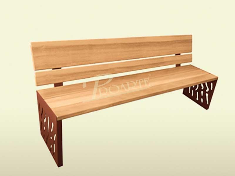 Con o sin respaldo; acabado barnizado en roble claro o caoba; información grabada a bajorrelieve mediante CNC y acabado a color con pintura especial ecológica al agua para exteriores.