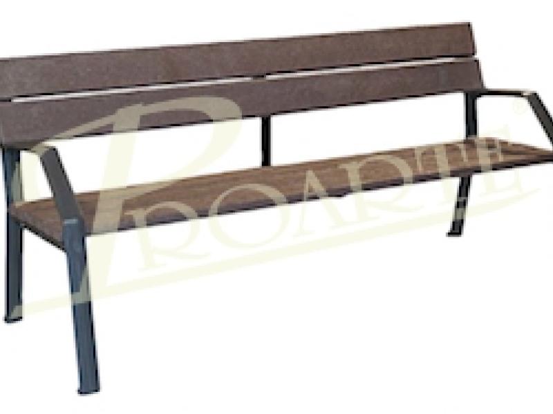 Banco fabricado en plástico 100% reciclado y reciclable. Estructura formada por patas con reposabrazos en forja y revestimiento de perfiles de plástico reciclado. Acabado color marrón. Tornillería de acero cincado. Dimensiones del conjunto 180 largo x 62 ancho x 82 altura cm. OPCIONALMENTE anclado al suelo con varillas (NO incluido herrajes de instalación).