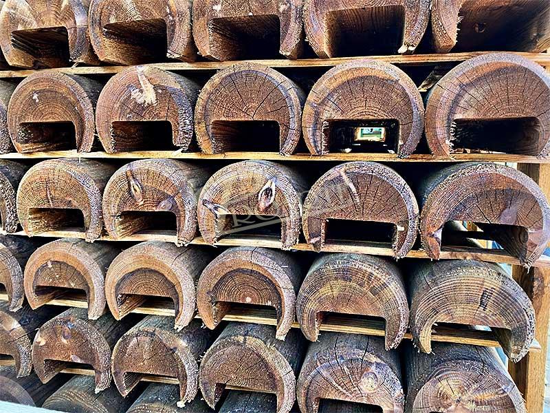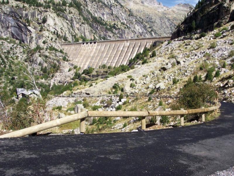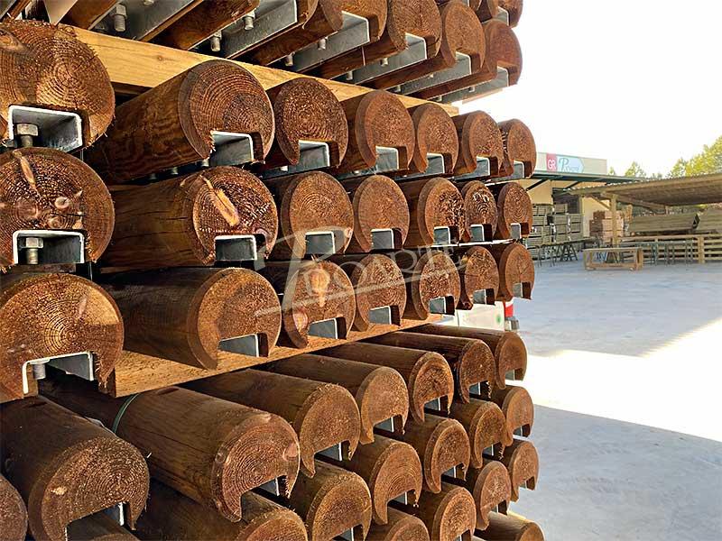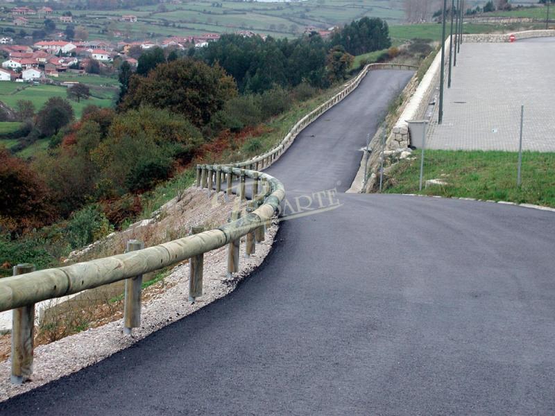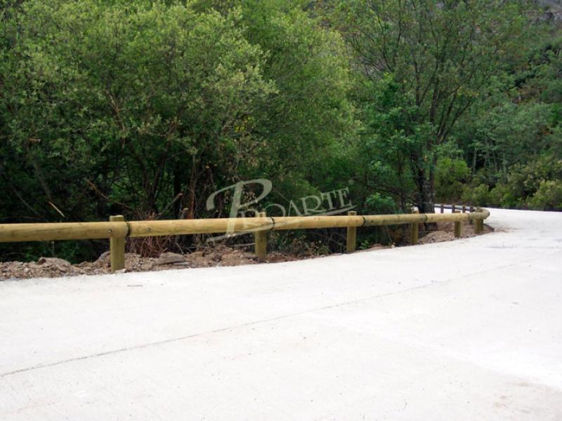 Barrera de seguridad para carreteras homologada, mixta. Estructura metálica y revestimiento en madera para exteriores tratada riesgo IV.