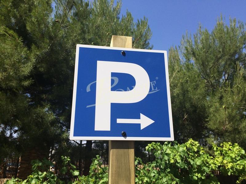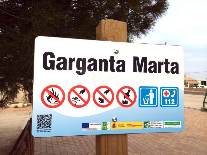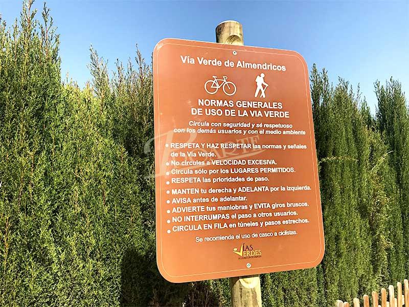 Cartel fabricado en placa de resinas termo-endurecidas con información a una cara rotulada en vinilo polimérico laminado UV y con protección anti-grafitti.