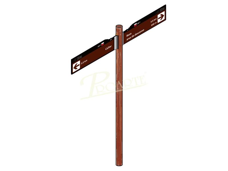 Flecha fabricada en placa de resinas termo-endurecidas rotulada con vinilo polimérico laminado UV y con protección anti-grafitti. Unión a poste por medio de pletina metálica en aluminio extrusionado (modelo PROARTE) acabado lacado al horno.
