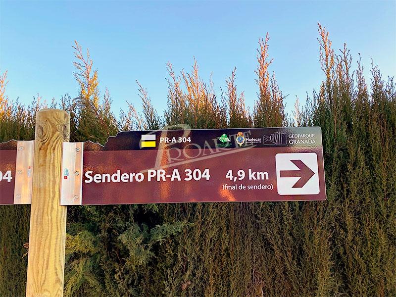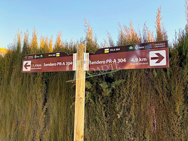 Cartel direccional fabricado y diseñado de acuerdo al Manual de Señalización Turística del Geoparque de Granada.