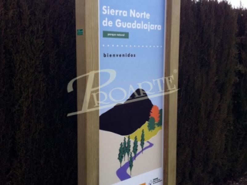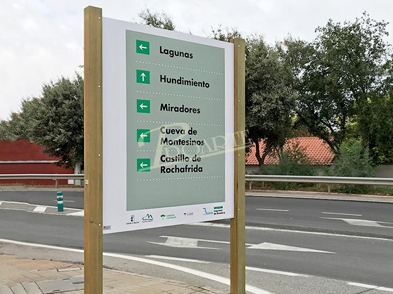 Cartel fabricado en madera para exteriores tratada riesgo IV. Soporte gráfico formado por placa de resinas termo-endurecidas e información a una cara rotulada con vinilo polimérico laminado UV y con protección anti-grafitti.