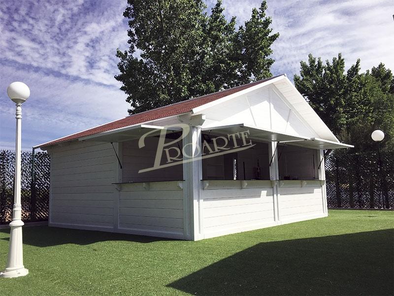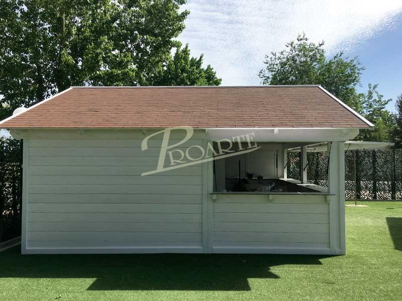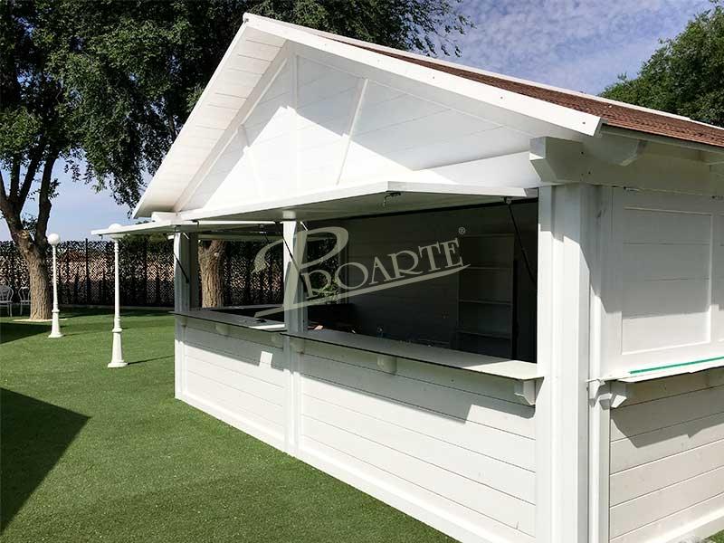 Chiringuitos de playa fabricados con madera para exteriores tratada riesgo IV. Estructura protegida por tejadillo a dos aguas.