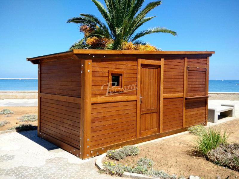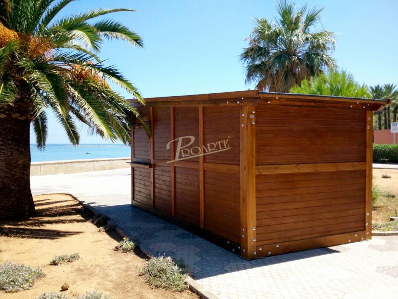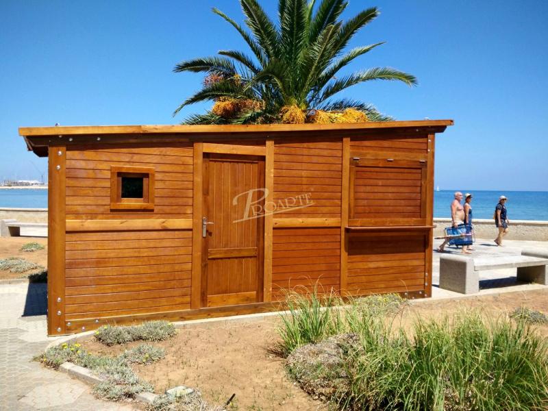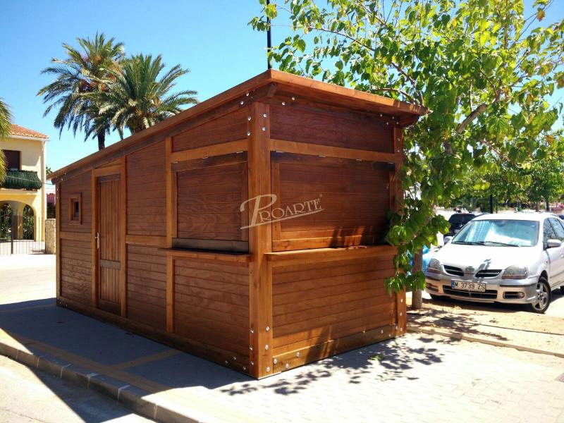 Chiringuitos de playa fabricados con madera para exteriores tratada riesgo IV. Estructura protegida por cubierta.