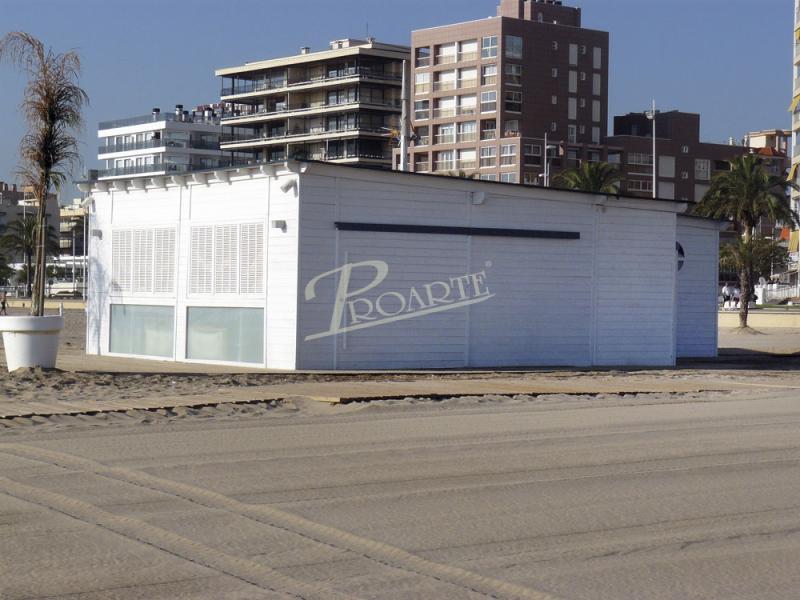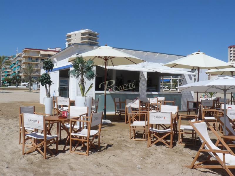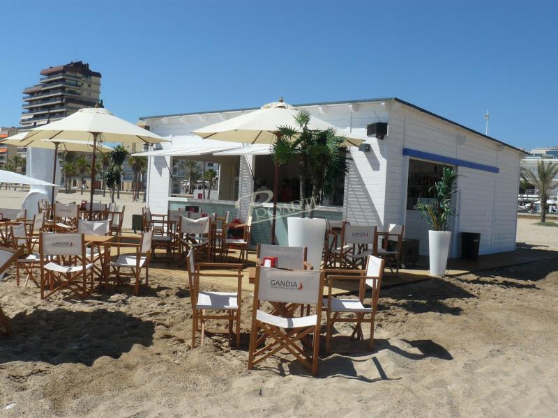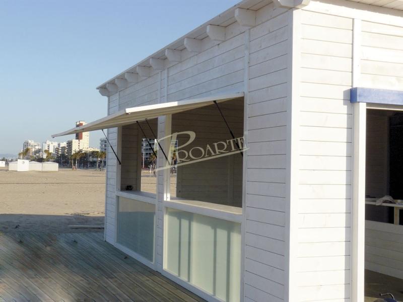 Chiringuitos de playa fabricados con madera para exteriores tratada riesgo IV. Estructura protegida por cubierta.