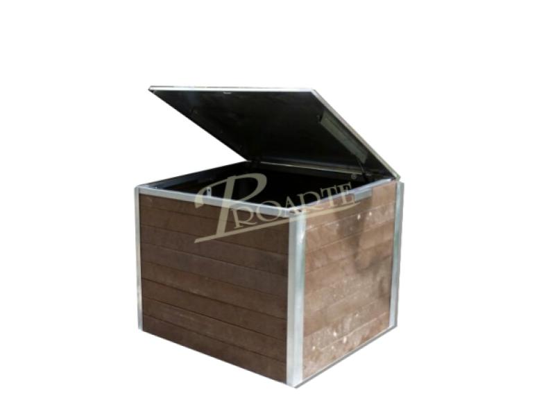 COMPOSTADOR DE PLÁSTICO RECICLADO. Compostador fabricado en plástico 100% reciclado y reciclable. Estructura formada por bastidor metálico y revestido por perfiles de plástico reciclado de 3 cm de espesor, cerrado con tapa superior. Capacidad de 100 ml. Acabado color marrón. Tornillería de acero cincado. OPCIONALMENTE anclado al suelo con varillas (NO incluido herrajes de instalación).
