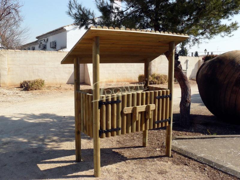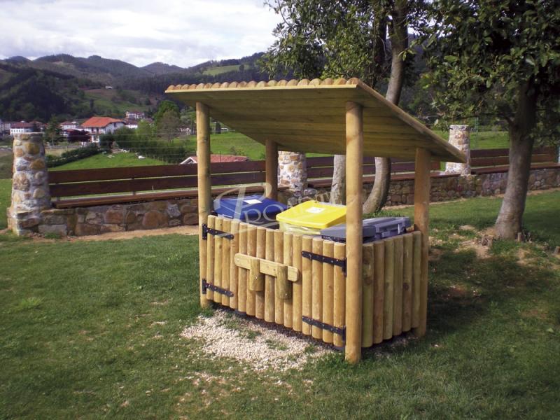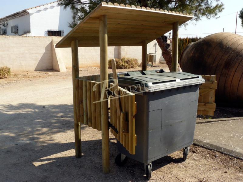Cubrecontenedor fabricado en madera para exteriores tratada riesgo IV. Estructura formada por medio rollizos, cuatro pilares redondos y un tejadillo a un agua inclinado protector; creando un recinto cerrado con puerta.