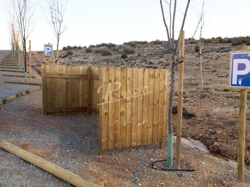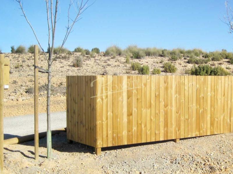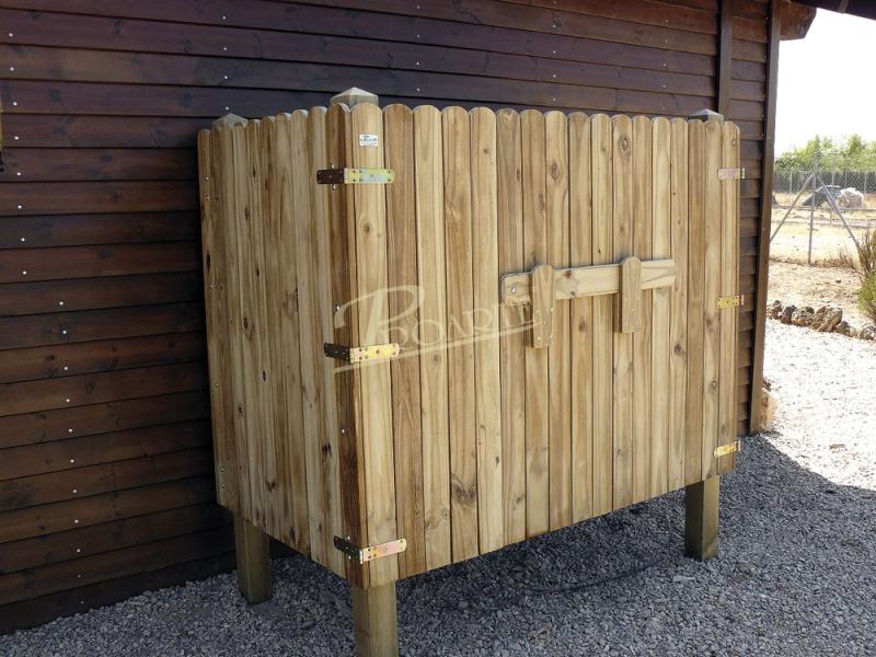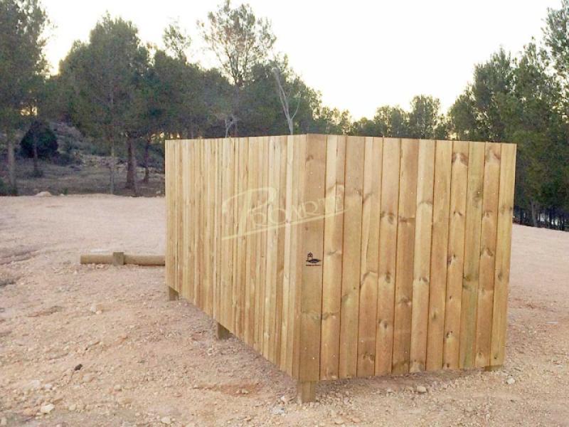 Cubrecontenedor fabricado en madera para exteriores tratada riesgo IV. Estructura con cuatro pilares cuadrados.