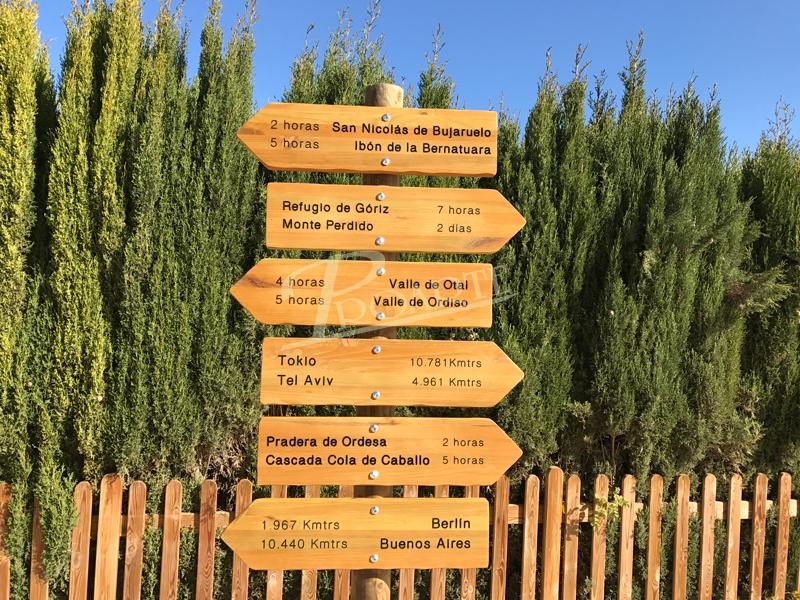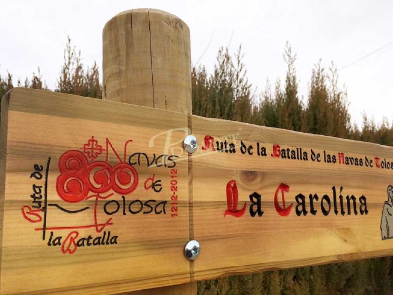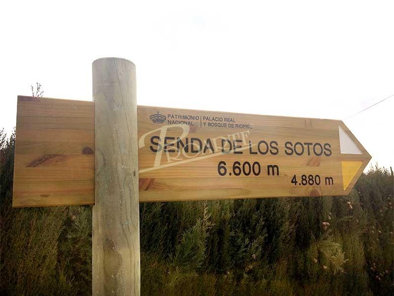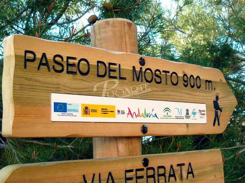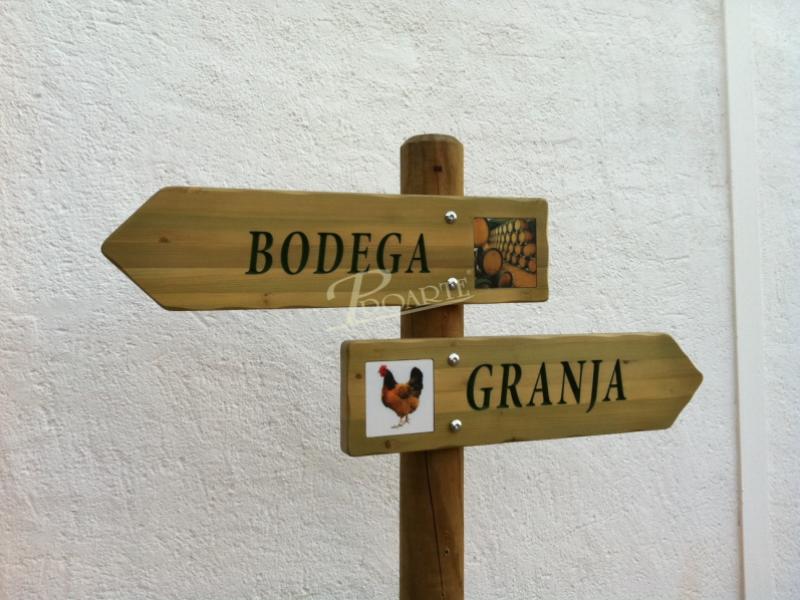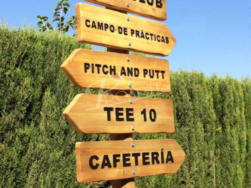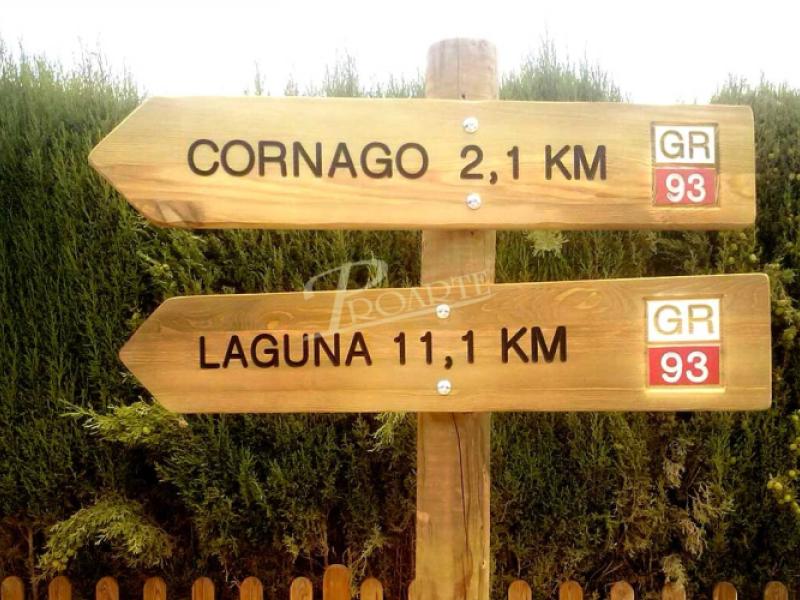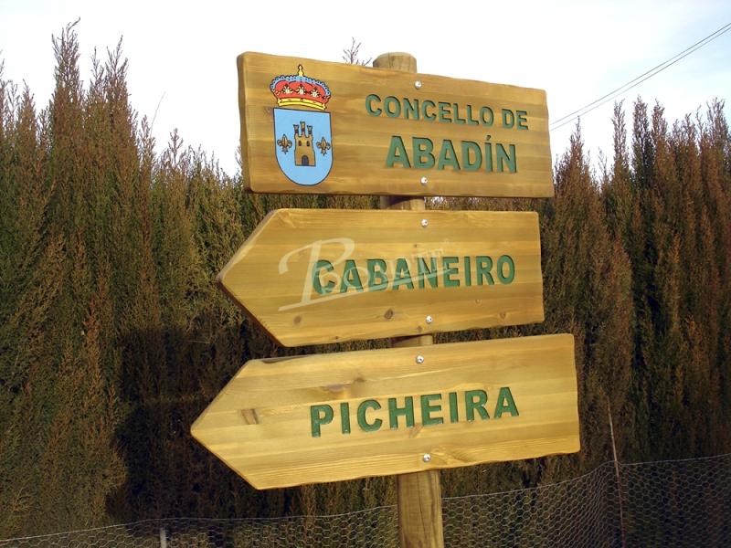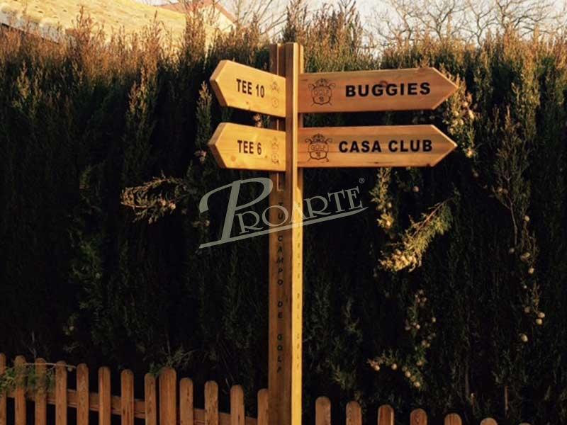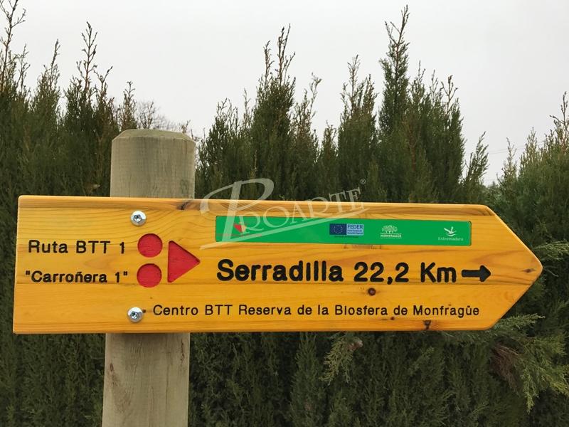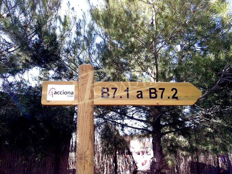 Flecha fabricada en madera para exteriores tratada riesgo IV. Información a una cara grabada en bajorrelieve mediante CNC y acabado a color con pintura especial ecológica al agua para exteriores.
