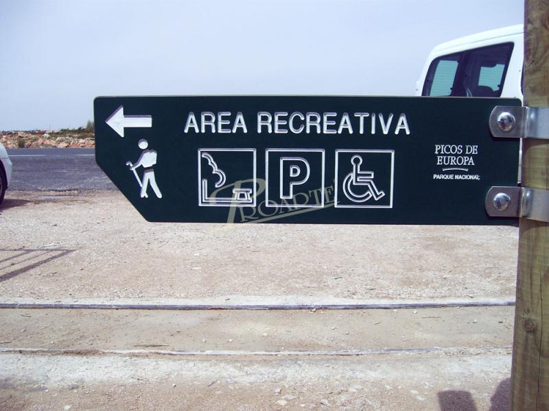 Flecha fabricada en placa de resinas termo-endurecidas con información a una cara grabada en bajorrelieve mediante CNC y acabado a color con pintura especial ecológica al agua para exteriores.