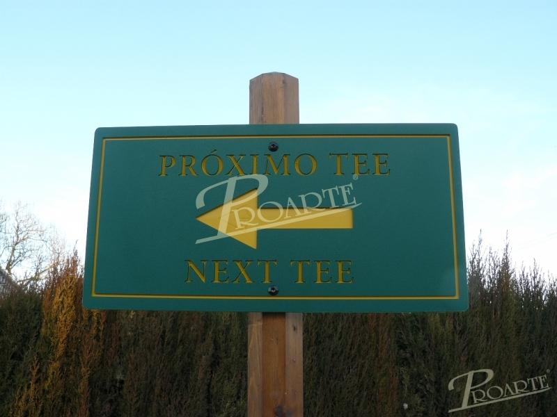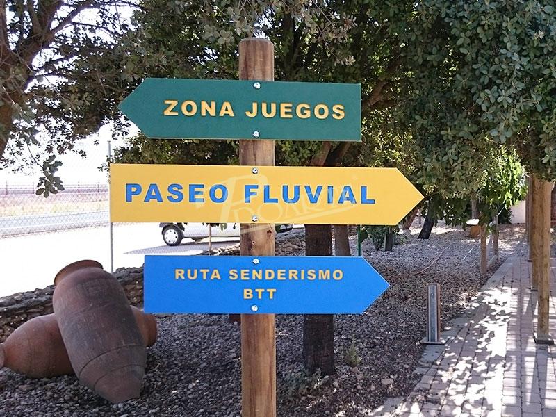 Flecha fabricada en placa de polietileno e información a una cara grabada en bajorrelieve mediante CNC y acabado con núcleo a color.