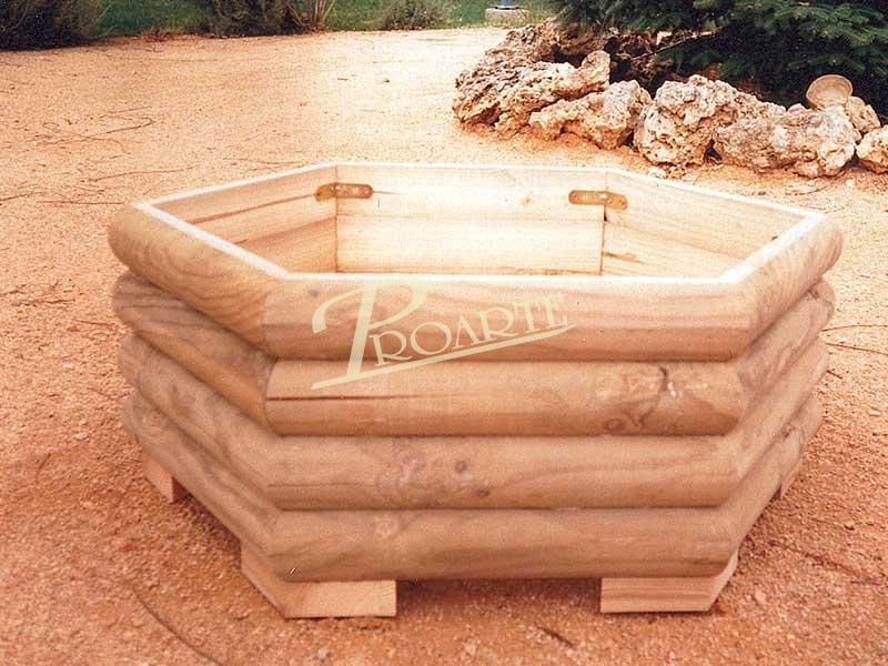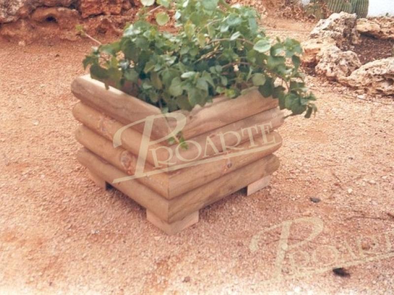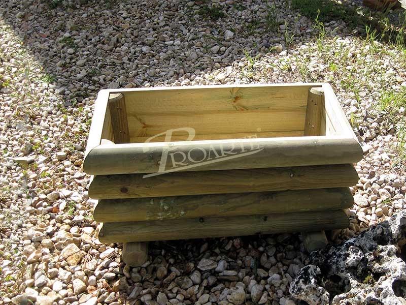 Jardinera fabricada en madera para exteriores tratada riesgo IV. Estructura formada por medio rollizo torneados y patas de sujeción en la base. Tornillería de acero cincado.