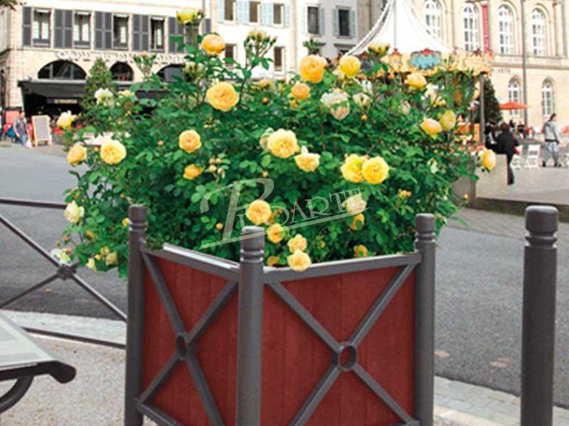 Jardinera metálica. Estructura formada por chasis y pies rectangulares de tubo de acero galvanizado, revestimiento de madera tropical, interior revestido de chapa de acero galvanizado, acabado pintado sobre galvanizado.