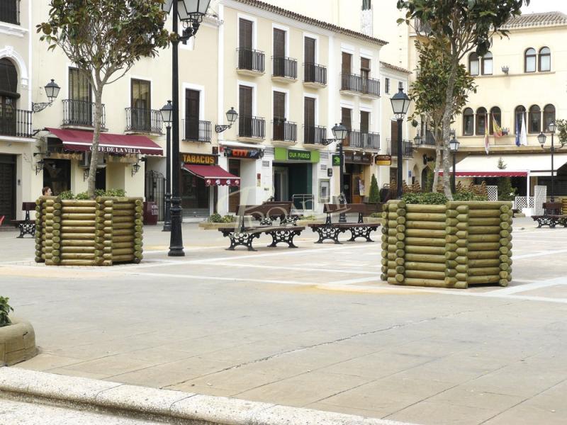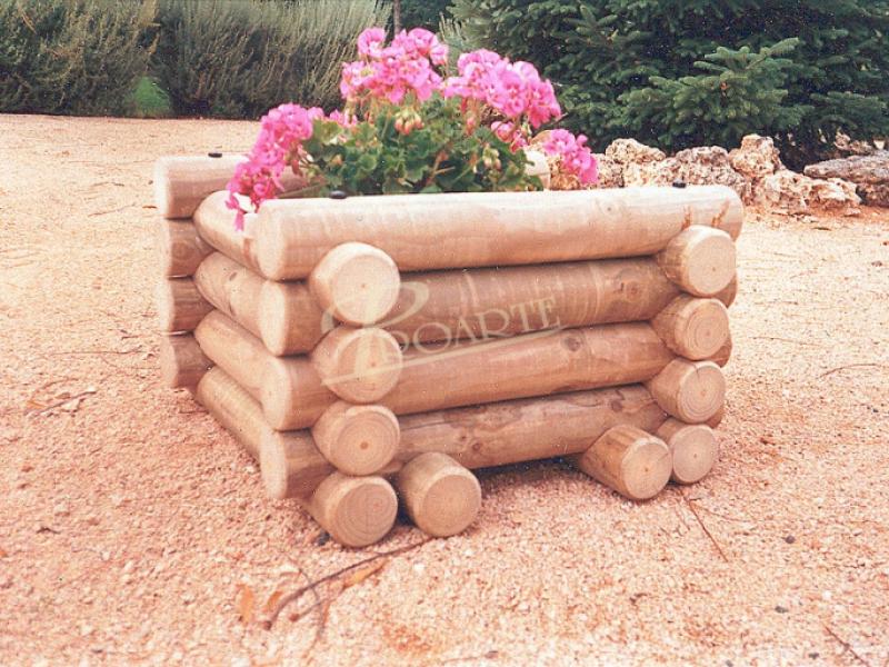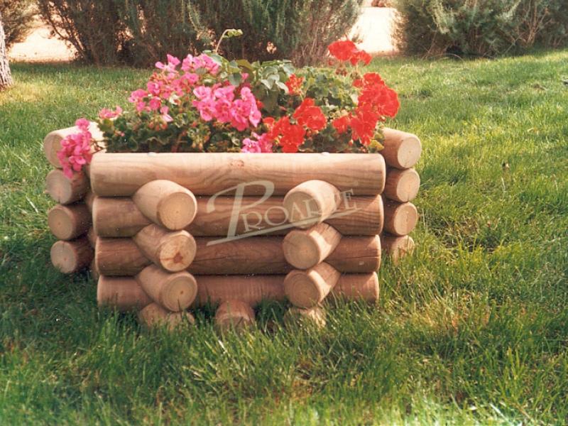 Jardinera fabricada en madera para exteriores tratada riesgo IV, forma cuadrada. Estructura formada por rollizo torneado y patas de sujeción en la base. Tornillería de acero cincado.