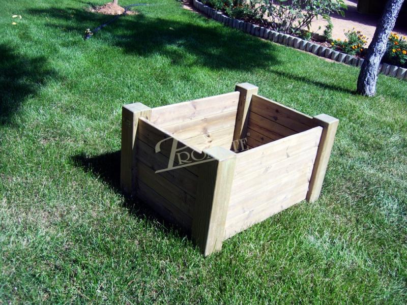 Jardinera fabricada en madera para exteriores tratada riesgo IV, forma rectangular y pilares estructurales. Estructura formada por tablas y patas de sujeción en la base. Tornillería de acero cincado.