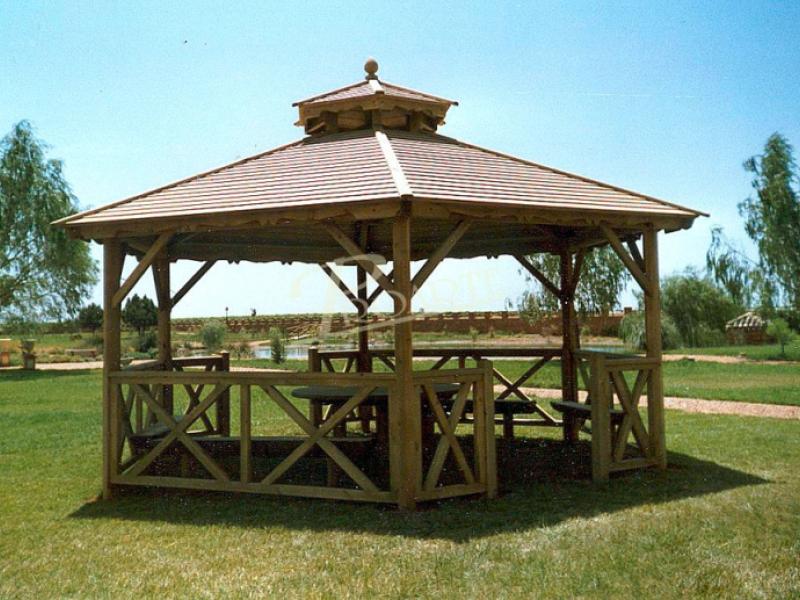 Kiosco fabricado en madera para exteriores tratada riesgo IV y cubierta con tejadillo a seis aguas.