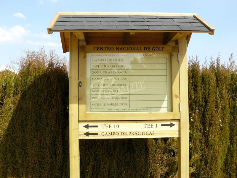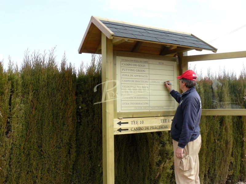 Marquesina informativa con tejadillo a 2 aguas. Fabricada en madera para exteriores tratada riesgo IV y soporte gráfico formado por placa de resinas termo-endurecidas de uso severo para exteriores e información a una cara con grabado bajorrelieve mediante CNC. Vitrina de puerta batiente (apertura lateral) y cristal de seguridad.