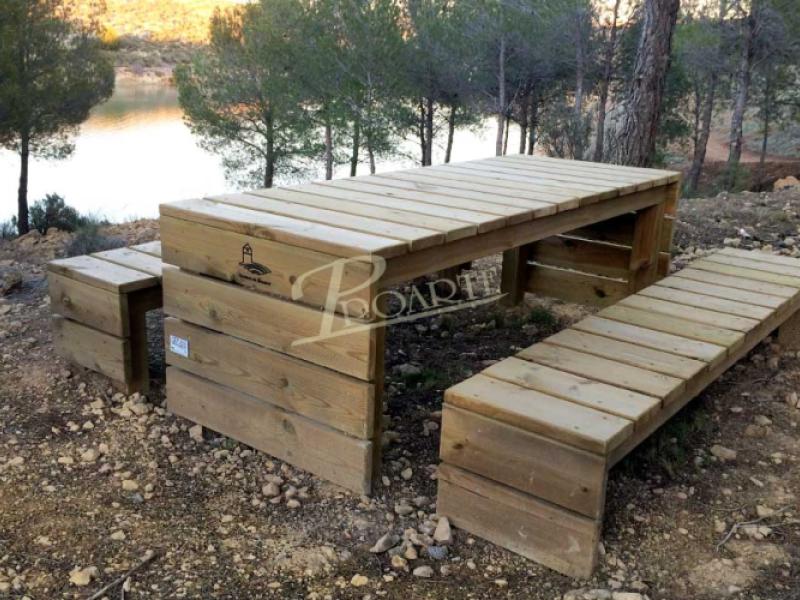 Conjunto de mesa fabricado en madera para exteriores tratada riesgo IV. Estructura formada por tablas dispuestas transversalmente, con dos bancos independientes. Tornillería de acero cincado.