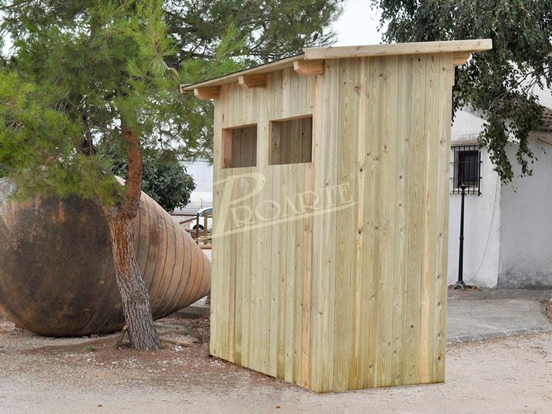 Observatorio para aves fabricado en madera para exteriores tratada riesgo IV. Cerramiento horizontal con tabla cepillada y abierto por uno de sus laterales. Cubierta a un agua protegida con teja asfáltica. Tornillería de acero cincado.