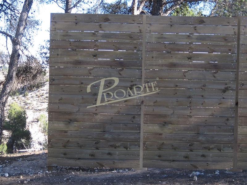Pantalla acústica fabricada en madera para exteriores tratada riesgo IV. Estructura formada por tabla con dos postes de sujeción.