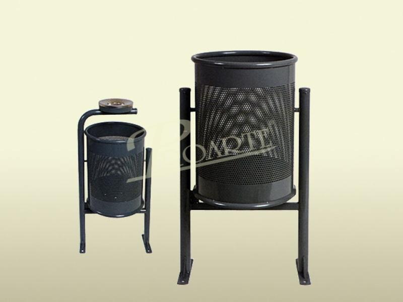 Papelera metálica fabricada en chapa de acero, perforada y pintado epoxi al horno. Estructura formada por cubeta abatible y dos postes de sujeción.