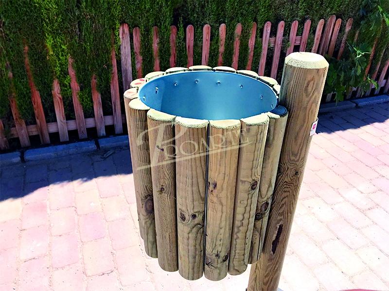 Papelera fabricada en madera para exteriores tratada riesgo IV. Estructura con medio rollizo, formando una cubeta circular y un poste de sujeción lateral. Tornillería de acero cincado.