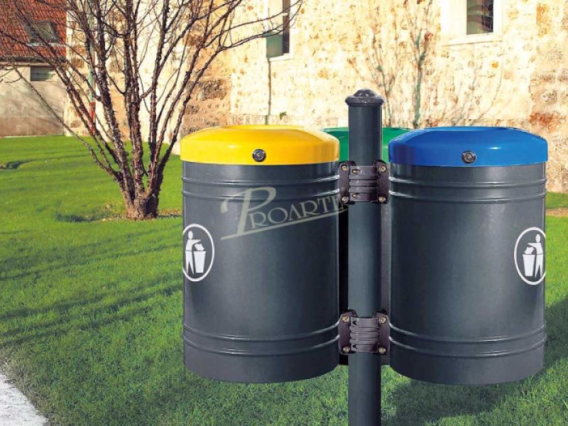 Papelera metálica fabricada en acero, formada por tres cubetas con tapa y asa de manutención y un poste de sujeción central.