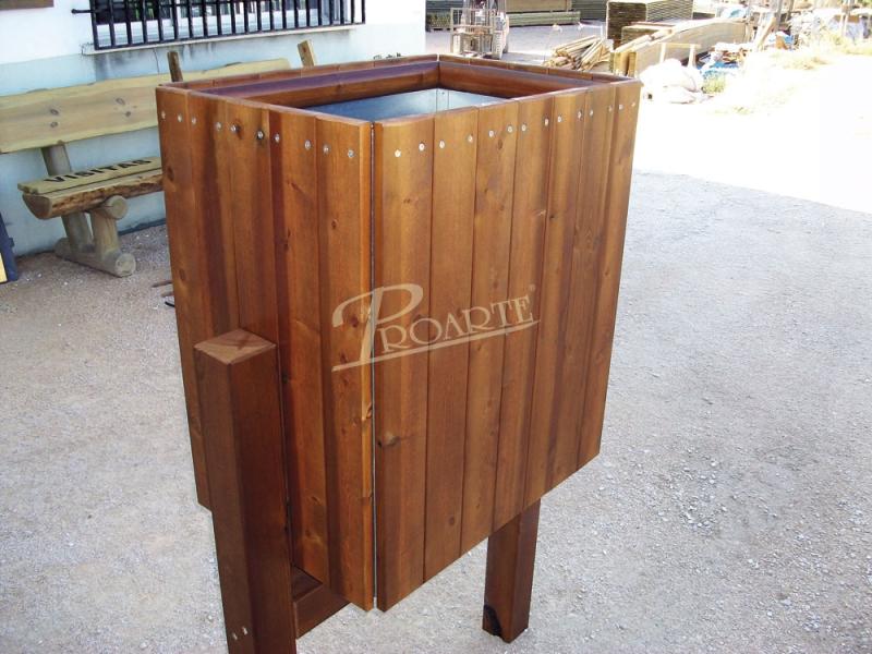 Papelera fabricada en madera para exteriores tratada riesgo IV. Estructura con tablas formada por cubeta metálica cuadrada y dos postes de sujeción. Tornillería de acero cincado.