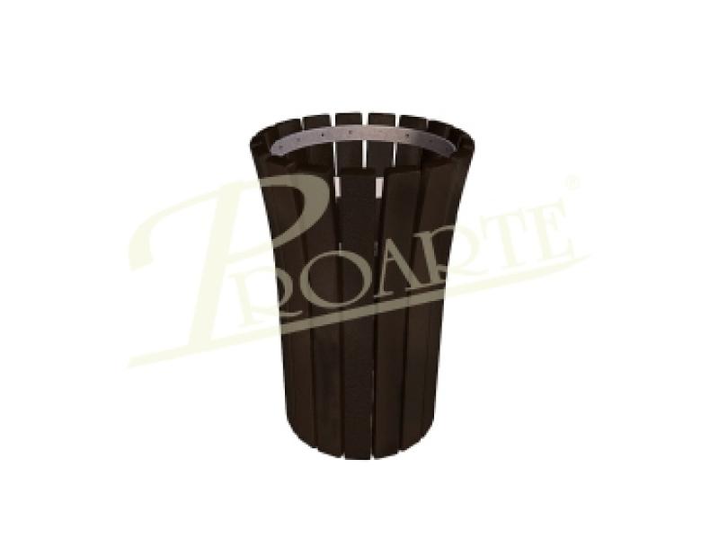 PAPELERA ROMA PLÁSTICO RECICLADO. Papelera circular progresiva fabricada en plástico 100% reciclado y reciclable. Estructura formada por perfiles de sección 7 x 3 cm y base hasta el suelo. Acabado color marrón. Tornillería de acero cincado. Dimensiones del conjunto 50 diámetro superior y 40 diámetro inferior sección cubeta 55 litros y 80 altura cm.