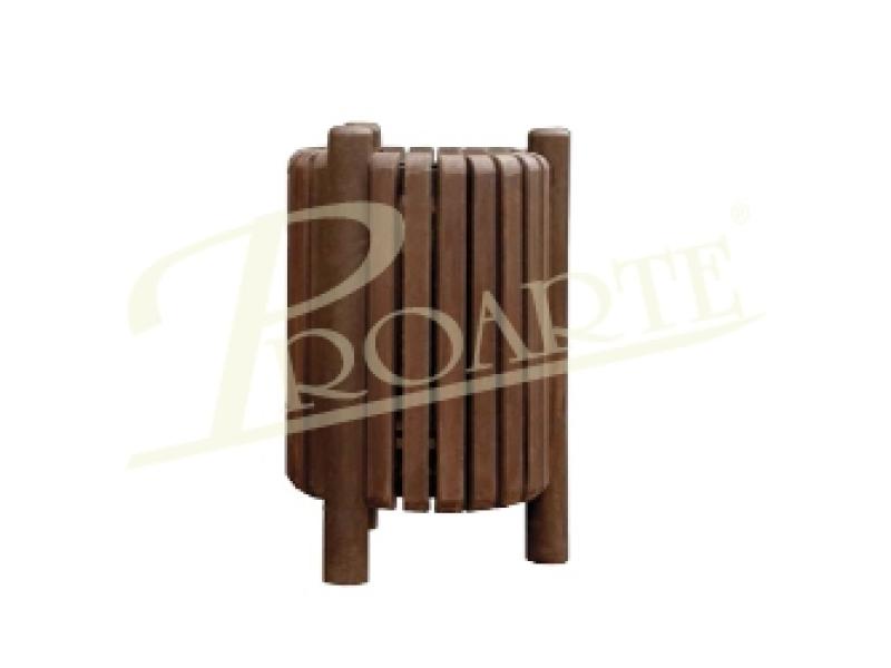 PAPELERA SALOU PLÁSTICO RECICLADO. Papelera circular fabricada en plástico 100% reciclado y reciclable. Estructura formada por perfiles de sección 10 x 3 cm y 4 x 4 cm, y 3 postes de sujeción de 7 cm de diámetro. Acabado color marrón. Tornillería de acero cincado. Dimensiones del conjunto 45 diámetro cubeta 40 litros y 90 altura cm.