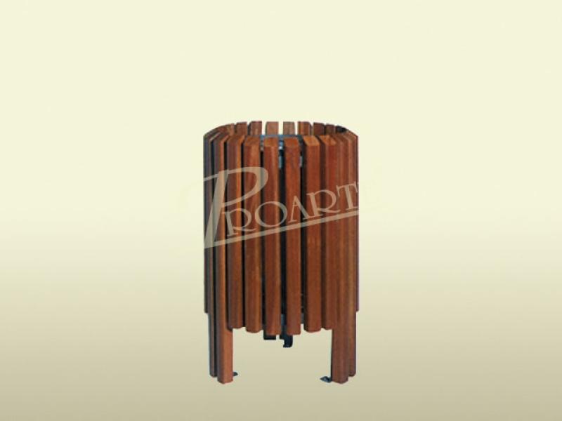 Papelera fabricada en madera tropical y estructura metálica. Formada por tablas de madera de guinea formando una cubeta circular, arco interior porta bolsas y estructura de acero pintada oxirón.