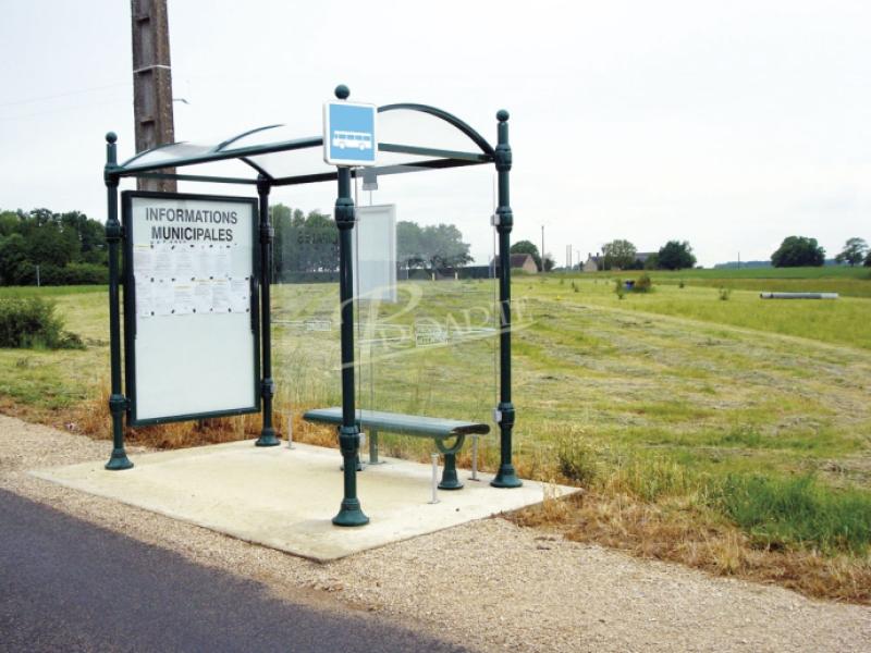 Parada de bus metálica formada por postes redondos, bases y abrazaderas de aluminio, cerramiento lateral y cubierta curva.