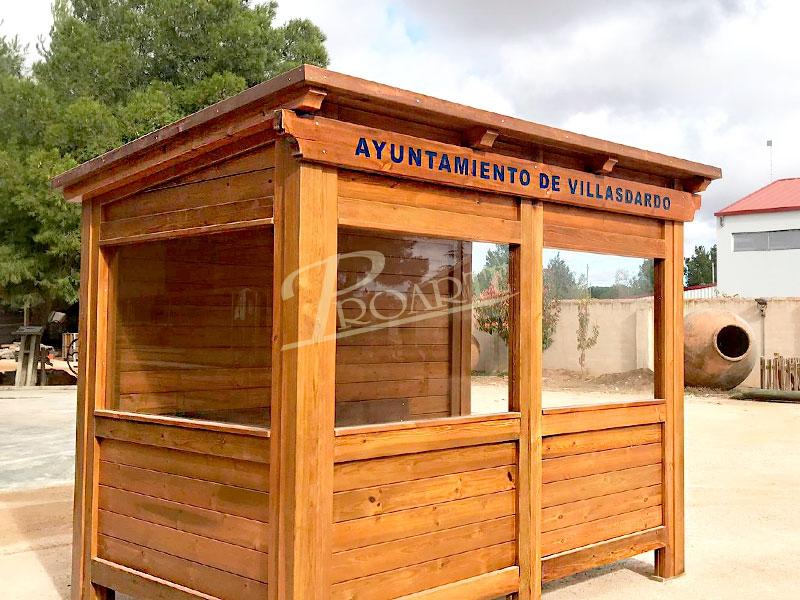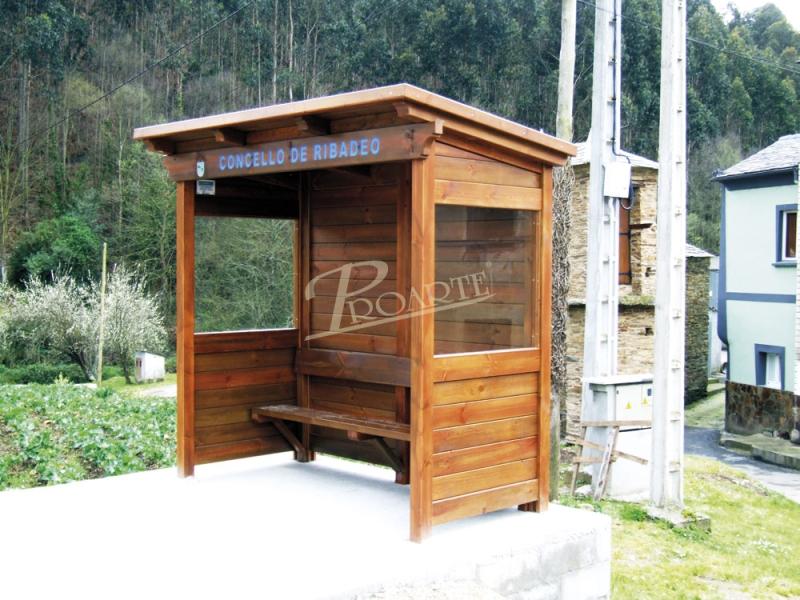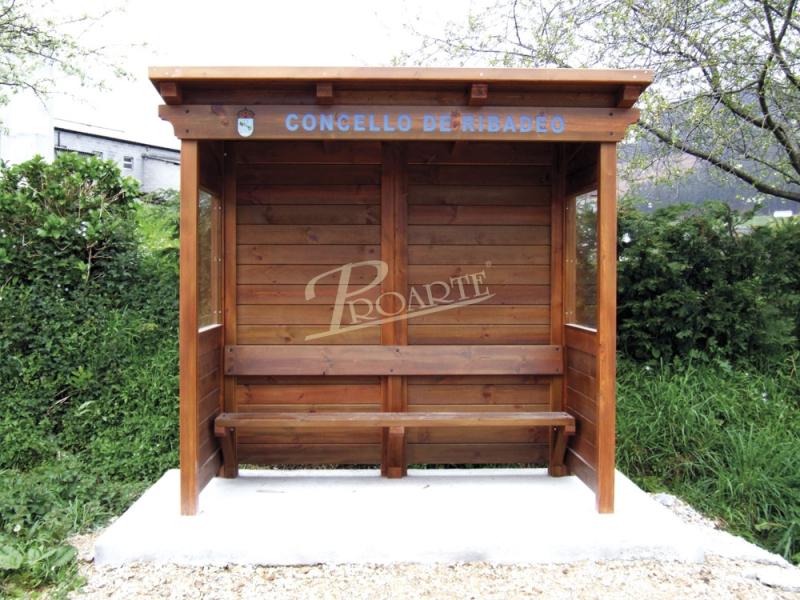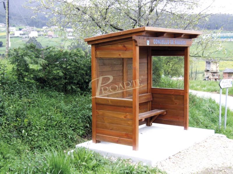 Parada de bus fabricada en madera para exteriores tratada riesgo IV. Estructura protegida con tejadillo a un agua.