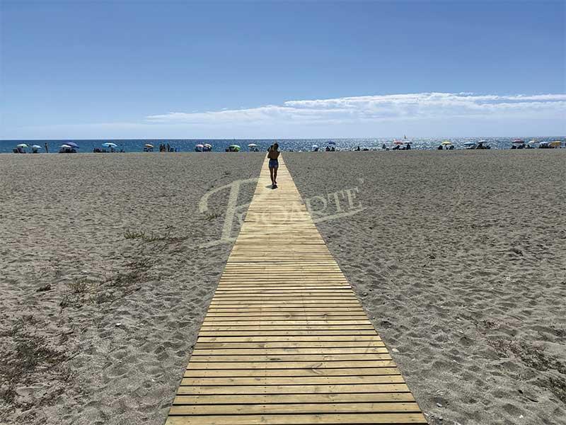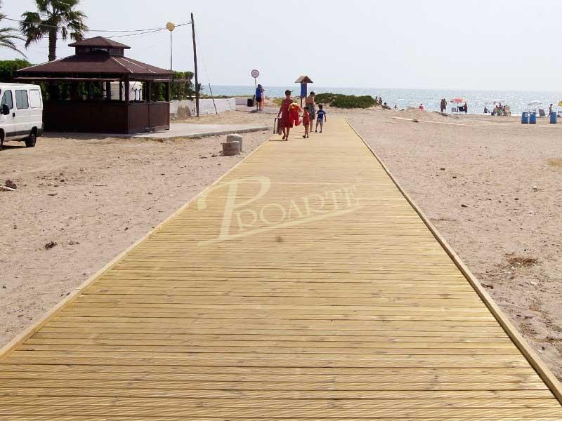 Pasarela rígida fabricada en madera para exteriores tratada riesgo IV. Estructura formada por tabla cepillada y tres rastreles. Tornillería de acero cincado.
