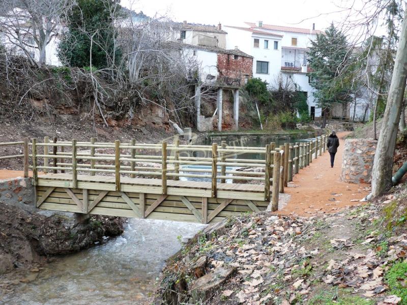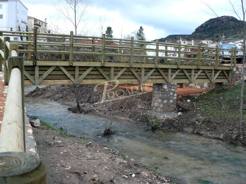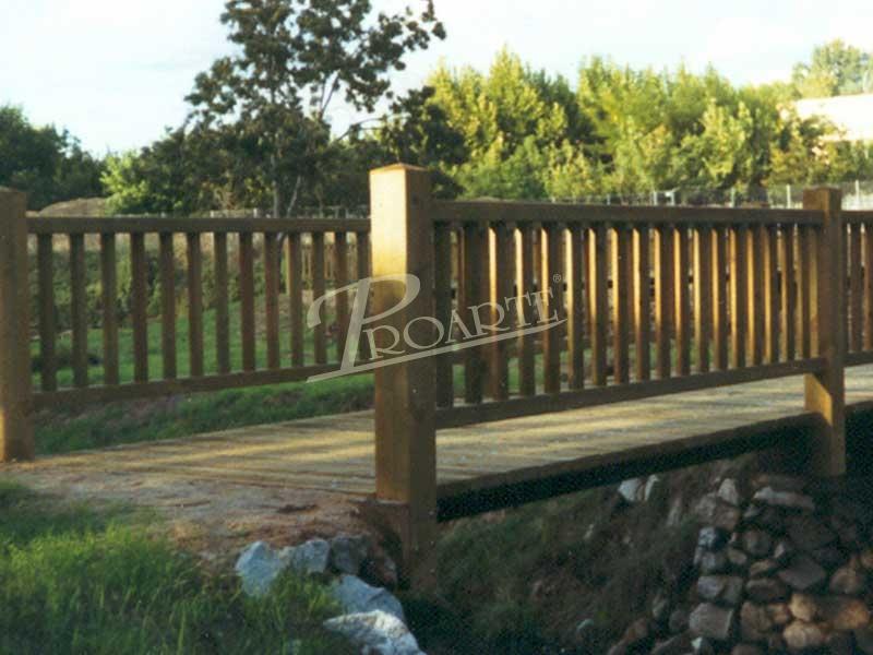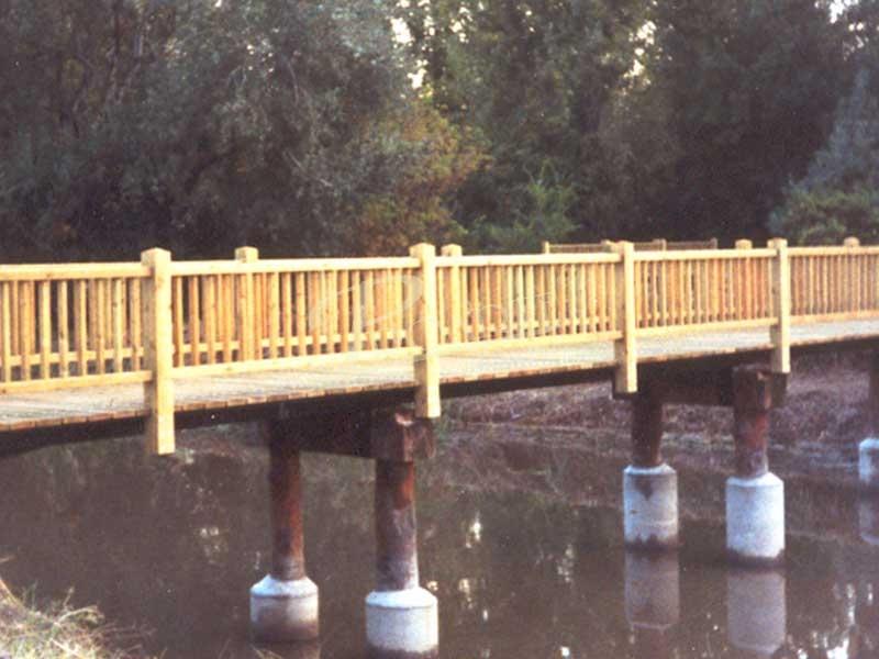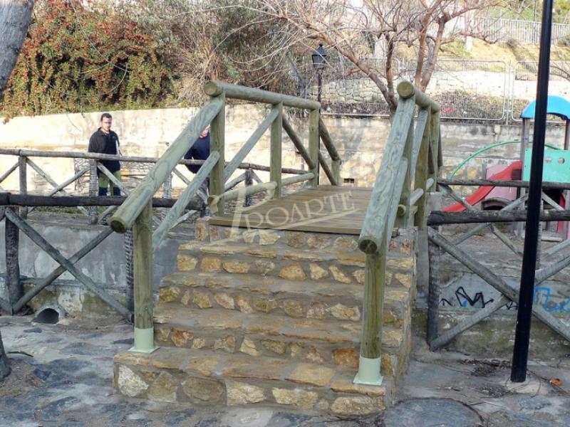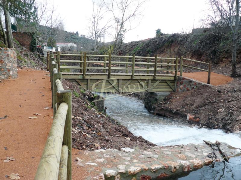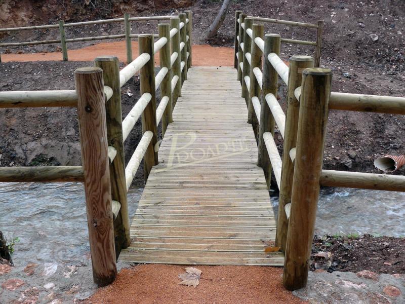Puente fabricado en madera para exteriores tratada riesgo IV. Tipología estructural conformada por vigas principales curvas y pilares estructurales, tabla ranurada para el piso y uniones mediante herrajes galvanizados en caliente. Tornillería de alta protección anticorrosión.