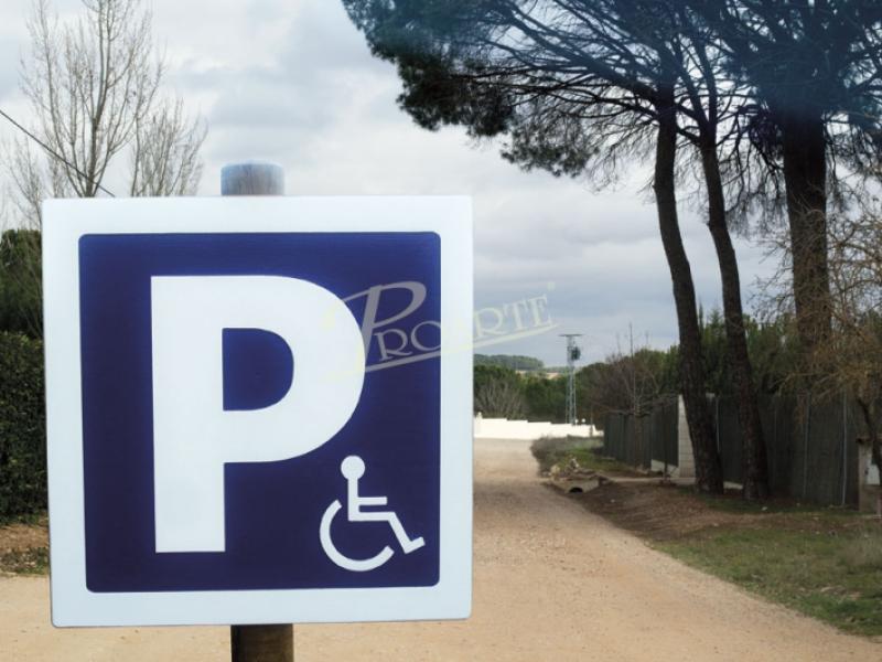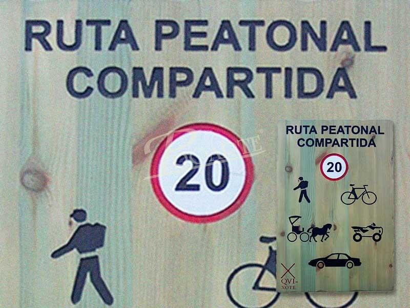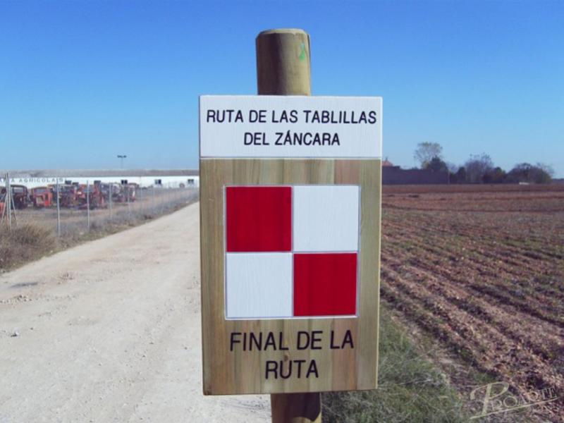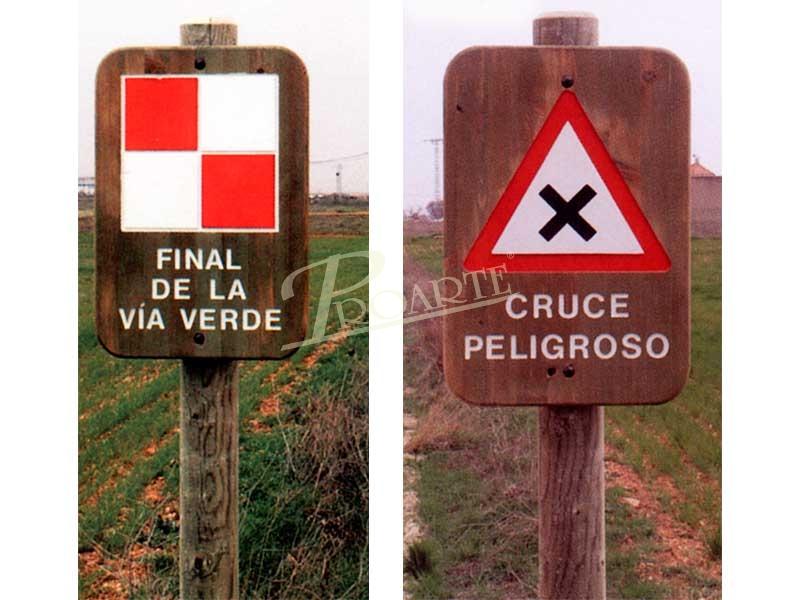 Señal fabricada en madera para exteriores tratada riesgo IV. Información a una cara grabada en bajorrelieve mediante CNC y acabado a color con pintura especial ecológica al agua para exteriores.