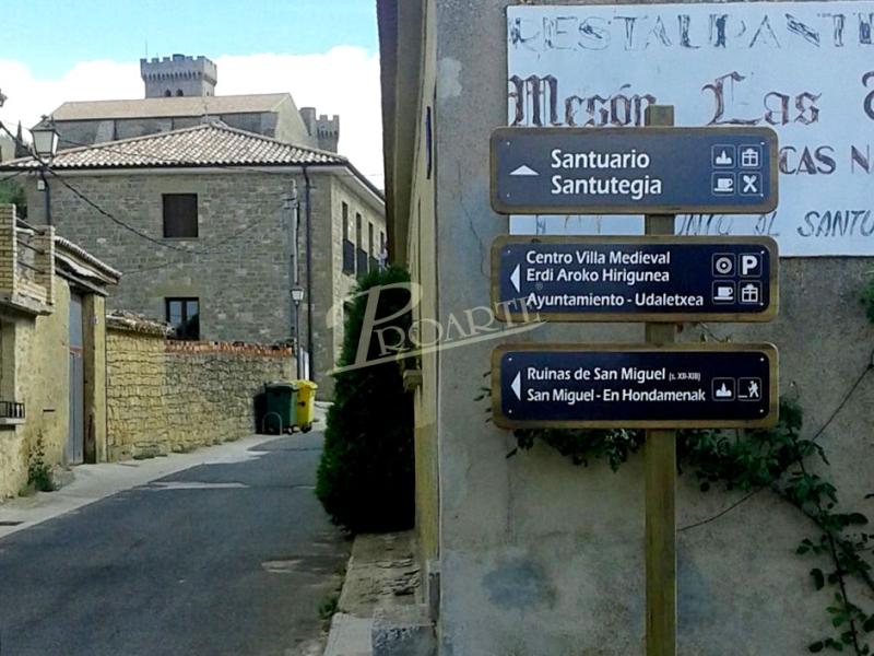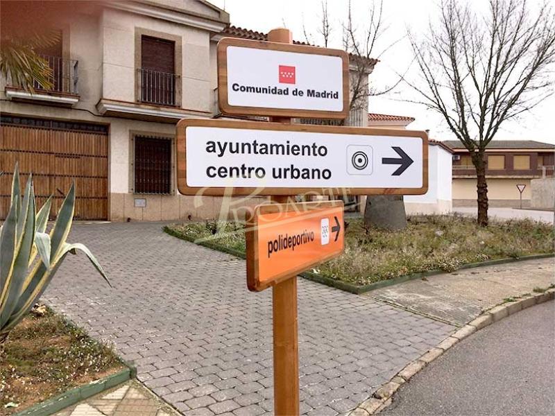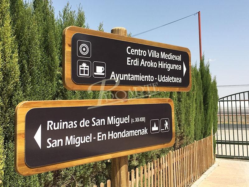 Señal fabricada en madera para exteriores tratada riesgo IV e información a una cara sobre soporte de aluminio-dibond rotulado con vinilo polimérico laminado UV y con protección anti-grafitti.