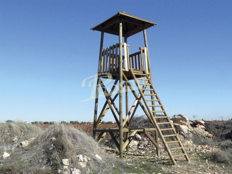 Torre de vigilancia fabricada en madera para exteriores tratada riesgo IV. Incluye plataforma mirador protegida con tejadillo a cuatro aguas y escalera de acceso. Tornillería de acero cincado.