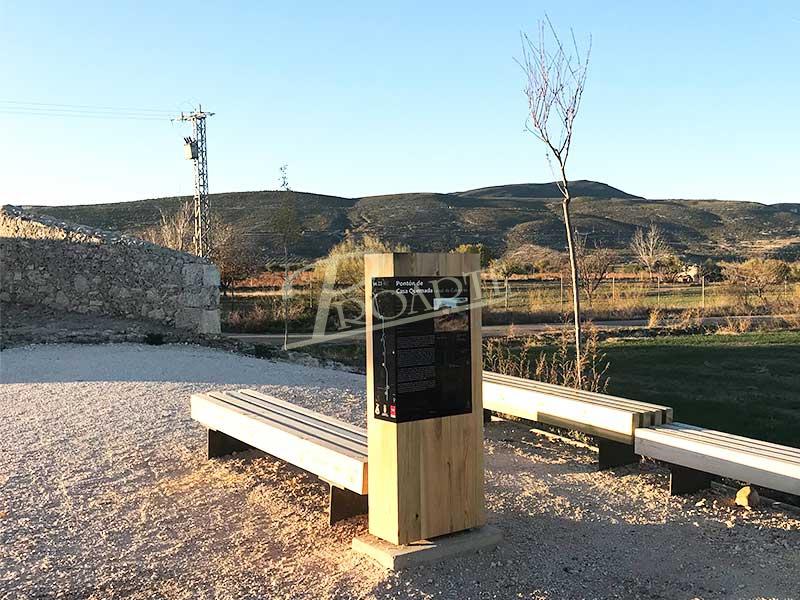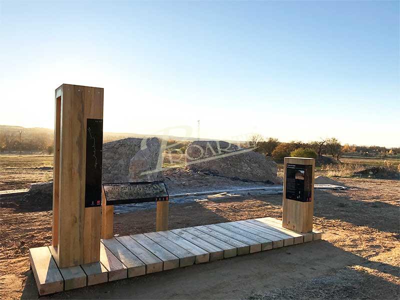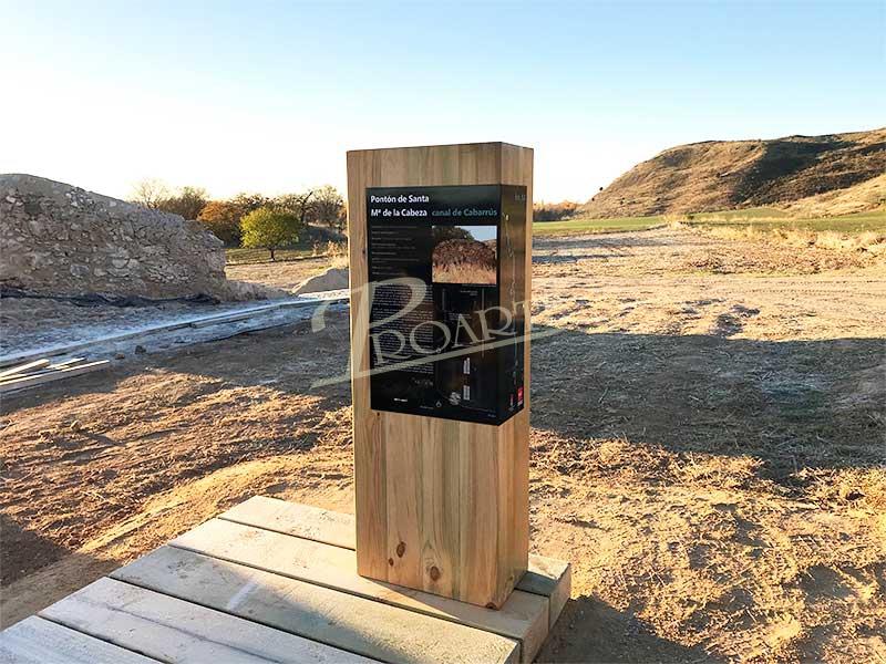 Totem fabricado en madera para exteriores tratada riesgo IV. Soporte gráfico formado por placa de aluminio-dibond rotulada con vinilo polimérico laminado UV y con protección anti-grafitti.